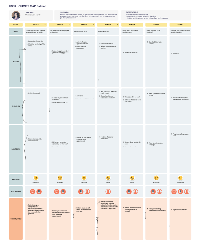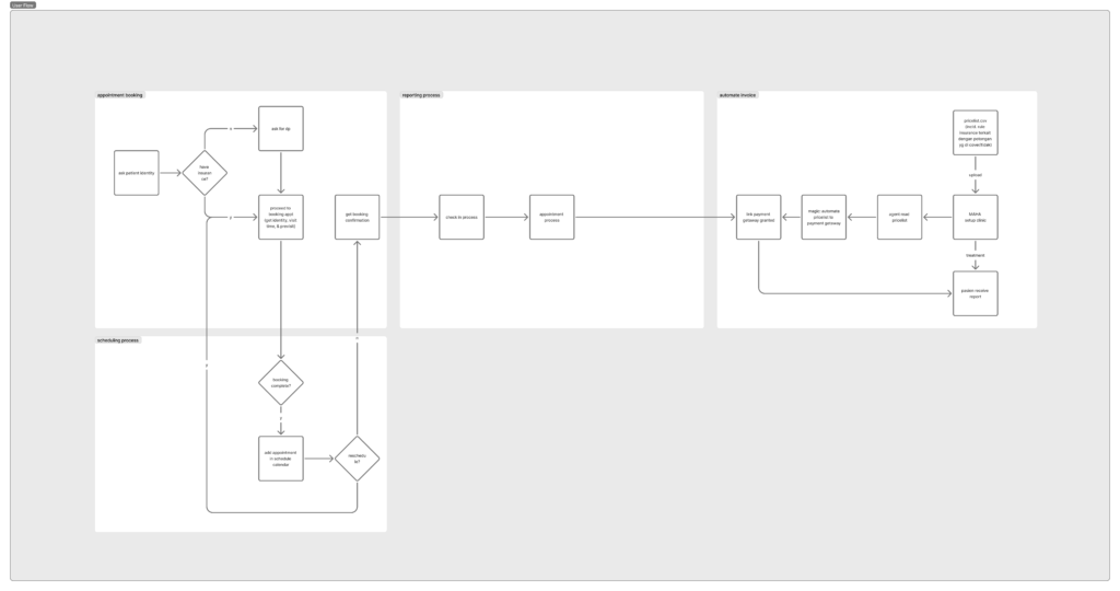 I started the designing process by creating a user journey for three user that will impacted by the updates. It’s Patient, Receptionist and also the Doctors.